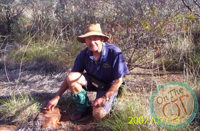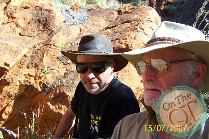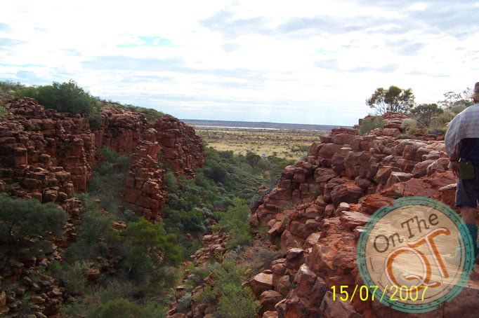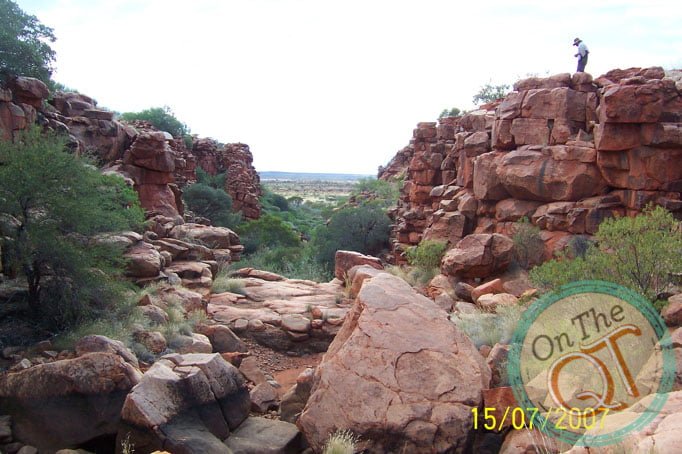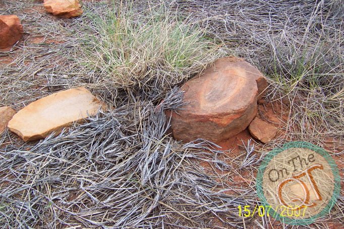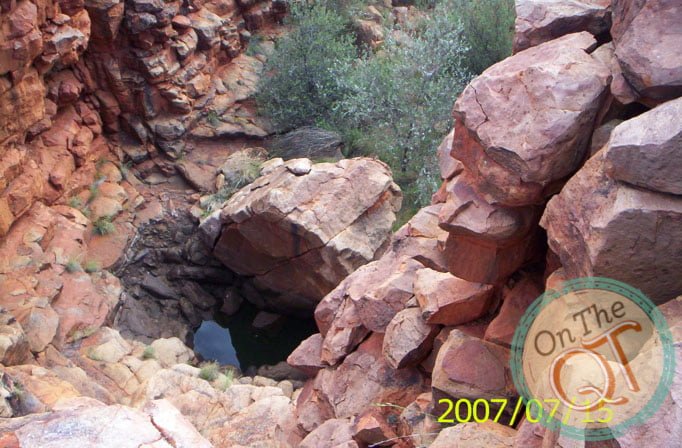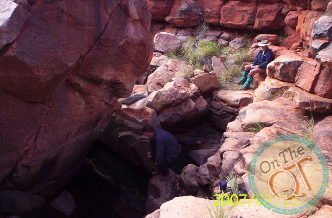 It is a nice, mild, pleasant morning. I am up first and I got the fire going and the water on for tea and washing the wear. One of our punctures is still causing a problem as it went down slightly overnight. Rob pumps it and it will get us by. We head to the Gorge about 1km away, which we failed to get to yesterday evening. We find Robs path that he made in 1985, it is incredible that it has existed all that time and this is a sign that nobody has been here since. We get to the Gorge by 7.55. It was a 5 minute trip and we park our vehicles and go exploring in the Gorge. The interesting thing about the trip is that it is broken up nicely with foot walking and climbing. The Gorge is incredible and easy to walk. There are lots of large rocks to stand on and progress is swift and good. We find water at the bottom of the creek which is about 2 to 3 ft deep. Its normal level is about 8 ft deep, in like a trapped rock base. Bird life is plentiful and they are suspicious to see us. It is incredible to be the first Irish person every to stand on this part of the world. Anyone that ever came here were with Rob. We find a rock painting which we photograph. This was chiseled carved stone many years ago. All the original Aboriginals were brought in to compounds since 1930 but this stone could be several hundred years old. We leave it exactly where we found it but we did photograph it. We make our way back to our vehicles and arrive at 9am. We are now the furthest away point from Perth on this trip, about 1750km. We are about 600km from the nearest civilised person. No one lived here as there is no water or roads. The summer temperatures go up to 45 degrees. We bush wack our way back from the Gorge and back up Robins trail again.