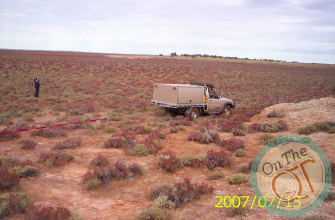We now begin to cross a dry lake which is 3 to 4km long. We make great progress until we begin to sink in soft mud. The other vehicles behind us do this also. We fail to go either forward or backwards and we get out to examine the vehicle. Mud everywhere. All the tyres are completely covered. Rob decided to leave down the air on the tyres. A few drops of rain fall on the cars and we reverse back over our track and find a path onto the new track. Rob drives it hard and we head to the shore about 1km away. The ground improves as we get nearer land. It is better to have one vehicle on shore than none. The other vehicles use the same techniques as us and all vehicles arrive back on dry land. A problem solved. All vehicles are re-pumped and we are ready to go again. I see a group of 7 camels in the distance. It is too far away to get some photos. The are the first animals we have seen today. We drive on around the shore of the lake. As we lead Rob gets off the lake onto land as the ground is soft again but it is too late for Nick, he gets bogged in the soft ground and is firmly stuck in 1 ft of mud. The last vehicle stops before it gets stuck. The 3rd vehicle is used to tow out Nick’s Nisson with towing chains and ropes which are about 100ft long. Both vehicles are connected with walkie talkies like phones with one person on the bank of the lake also connected giving instructions. Within 15 minutes Nick is out. We are now 1 day behind schedule and some places to call to will have to be cut from the trip but this is ok. We have to head inland and cut off a peninsula of the lake and get back on the lake again.