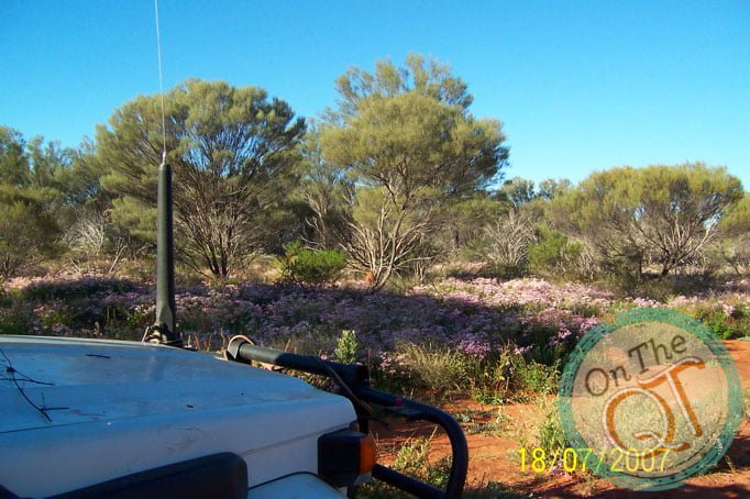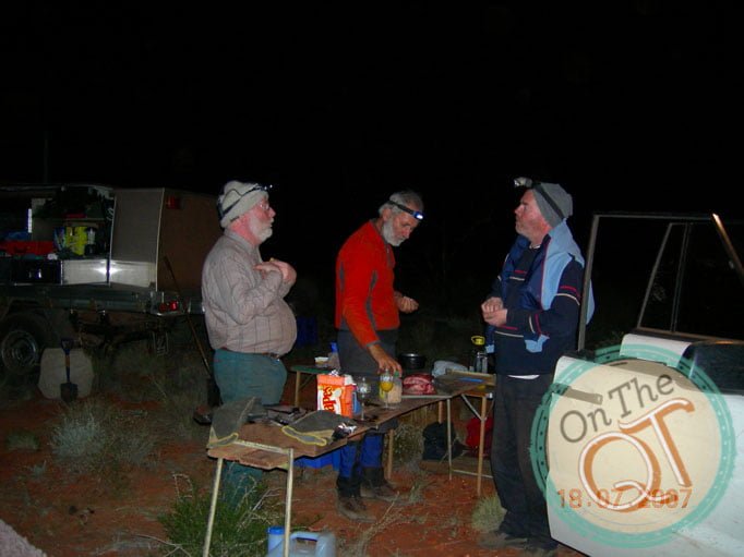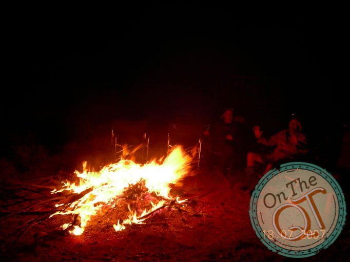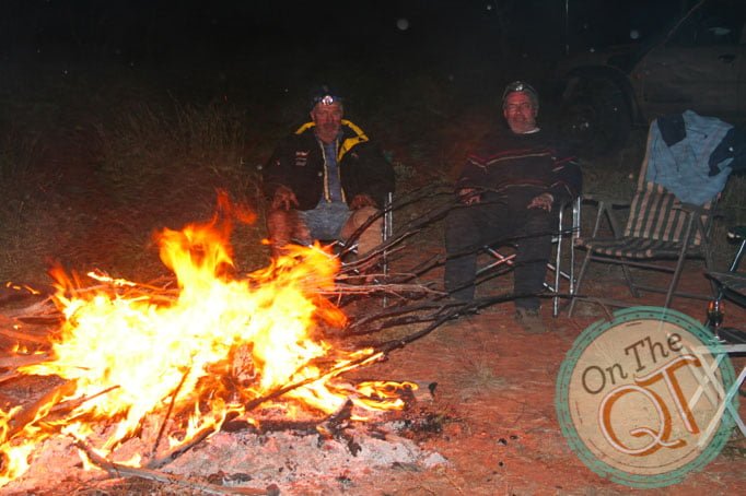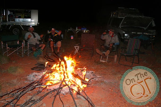 We branch off the Seismic Line and we head to a water well which is 10km inland on a track. Within 2km, we get our 6th puncture. It is changes quickly and within 10 minutes we are on the road again. The sun is sinking fast and we are forced to set up camp 2km from our destination. Its all hands on deck to repair punctures when we get to camp while we still have some daylight. There is a lot of timber in the area and we get a great fire going. Steak, potatoes, carrots, onions, red peppers….what a feast for dinner! Everyone gets a full potato tonight. I have noticed my stomach has lightened up since the start of the trip, this is mainly due to the exercise and perhaps a little less food. As the fire is excellent, we have a late night tonight at 10pm. It is cold getting into the swags but once inside, it gets nice and warm. I stare at the sky and see a few shooting stars in the space of a few minutes and drift off to sleep. I wake a few times during the night and check how early or late it is by the light coming from the camp fire.