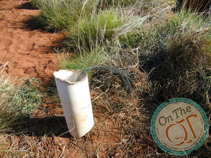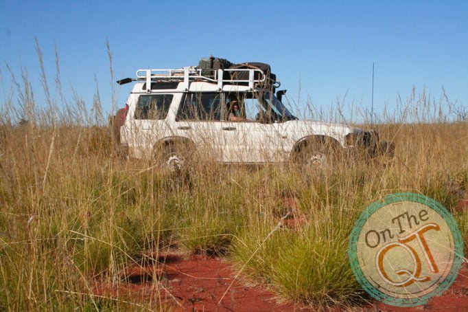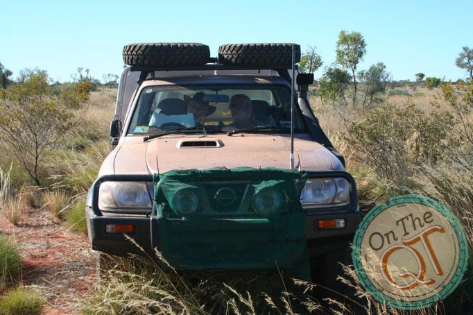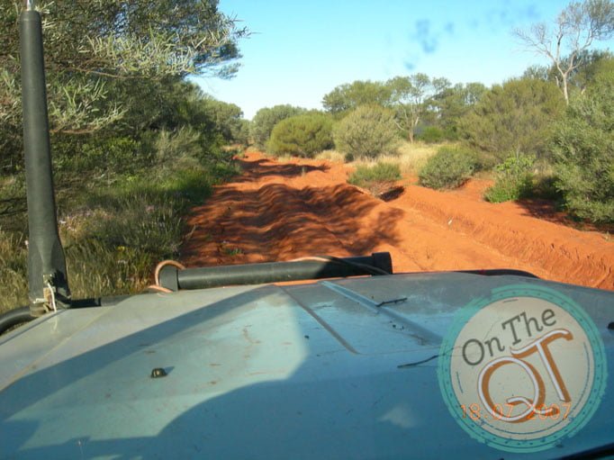We bush wack until 9.15am. One of our parties stops for a bog and the first vehicle drives on. We expect to have to drive like this for about 28km and it is tough going, particularly on the stomach muscles. We stop for coffee at about 9.30 and we thankfully found a path which is well used. This will save us a lot of time and make the journey more pleasant. Rob lets me drive and it is a fantastic feeling driving on the path with has not been used for perhaps 6 months. I pass over two sand dunes and the vehicle handles very well. At 11am, we hit the Seismic Line which was put in by the oil companies in the 70s. They went on for 100km and are straight with no turns or twists. They go straight over sand dunes. Oil companies brought heavy equipment for drilling at that time and some wells were drilled and capped. They were not thought to be commercial at that time. We stay on this straight Seismic Line for 6km and then turn onto an old track created by Rob in 1995. We loose it after 1/2 km and we head onto a new track to a water well which is basically a spot on the map. It takes us about 10km of easy driving and we find our destination but it is a dry hole with nothing here. We head back to the Seismic Line and join it quickly. At 12.45 we decide to have lunch and then head 18km on the Seismic Line. In effect, we are heading South, South West to get back to civilisation. The road is rough at times, particularly as we climb. It acts as a runway for rain water and it shapes gullies into the road. I see a group of 6 Emu’s, like Ostriches running in the distance, too far away to take a picture. At 1.45 we as the lead vehicle stop to allow the others to catch up and it gives us a chance to stretch our legs. We drive on then and sometimes we have to go off the track because it is too rough. At one stage there is a high gully in the road, created by rain.