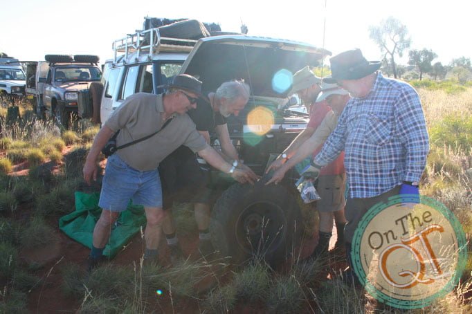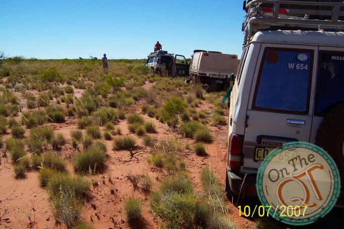We now make the road with only a GPS bearing to work to. We travel with a dry creek(river to our left). This is incredible as I am literally shaken about in the vehicle. We are leading in Nick’s Nissan and we get bogged down. The other jeeps come to our assistance and elastic type ropes called snatch traps are used to pull us out. About 80ft is attached and we pulled and sort of bounces out….MAGIC… we are away!! We now fall in behind as the 2nd car and Rob is the leader. It is hot at 23 degrees and you must wear sun cream. There is not a cloud in the sky and has not been since I arrived. We follow the creek to our right. Rob gets his first puncture and it is repaired quickly. 5km p/h for the next several km.