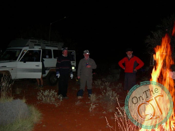 We set up camp at about 5pm. 30 minutes before the sun goes down! We are 15km behind schedule. The bush was much higher than was expected. One can never say you will be at a certain place at a certain time. It is hoped to make it up over the next 8 days. If not something has to get cut out. It is cold tonight. We layer up with clothes(track suit bottom, warm jumper and even a coat/jackets) as the sun goes down. The cold hits one on the back. The camp fire is great and timber is gathered for both tonight and the morning. It is in plentiful supply and one seldom has to go 40ft to find the total requirements. Dinner consists of 1/2 potato each, fried chicken, cabbage, peas and sweetcorn. Dessert is fruit and ice cream. The rule is who ever prepares dinner does not do the dishes. Good light is provided from the fire and leads from extras batteries on all of the vehicles.
