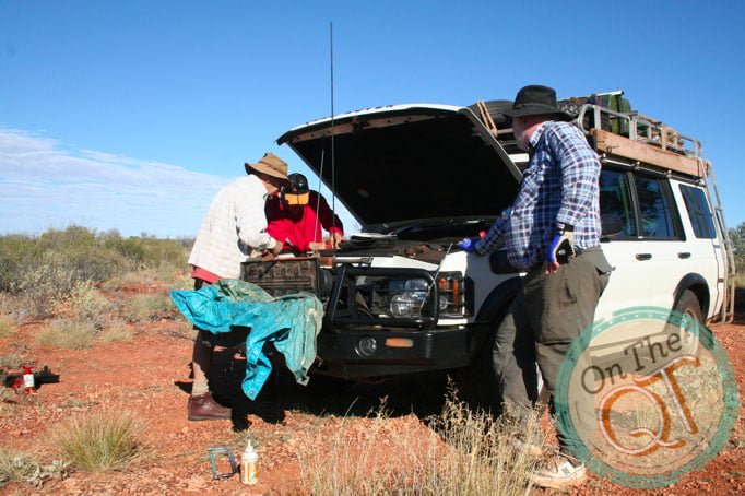 On the road for 8AM. Another lovely day. On our way to a water creek about 10km away. Very flat country and able to travel at 40km p/h. This is where the water came from for the village. It was powered by solar panels to drive the pump back to the village. Some lights are on in the van that we need to call Kevin, our mechanic to look at it. Not a great place to have car trouble, 100km from the nearest person. Traction control and ABS light is on. After 30 minutes or so and we decide to use the satellite radio to call the garage in Perth. After 3 attempts we get through to the correct person in the garage in Perth. He asks us to disconnect the batteries and leave it for 10 minutes. Also to take out the computer and check it for dust or oil seams. One has to think how long you could be out here. We see three cows and you have to wonder how they survive. Water diesel and your vehicle are the 3 most important things when you come out here. 10 minutes has passed and we refit the batteries and computer. We took some photos in between to keep it light. I can sense Rob, our leader is tense. We are lucky to have Kevin in the group who knows about cars. We restart and one of the main red lights has been fixed but there are 2 more lights that remain on. We check each fuse one by one and they are ok. We need to call the garage again. We got through and they advised us that we can drive with the lights on. Is is good to hear this.